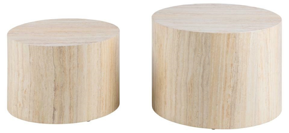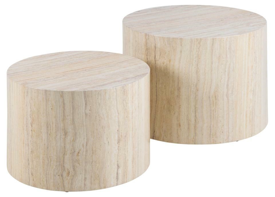 Zestaw 2 okrągłych stolików kawowych Dice wykonanych z płyty MDF w okleinie imitującej naturalny kamień. Umieszczone przed sofą lub z boku, te okrągłe stoliki kawowe dodadzą eleganckiego wyglądu Twojej przestrzeni życiowej. Niezależnie od tego, czy stoją razem, czy osobno, tworzą interesujący wizualnie punkt, który przyciąga uwagę. Ich opływowa sylwetka i okleina imitująca naturalny kamień wnoszą nowoczesny i niebywale elegancki wygląd, dzięki czemu pasują do każdego stylu wnętrza. Wymiary stolików: większy: średnica 58cm wyskość 40cm i mniejszy: średnica 50 cm, wysokość 33cm