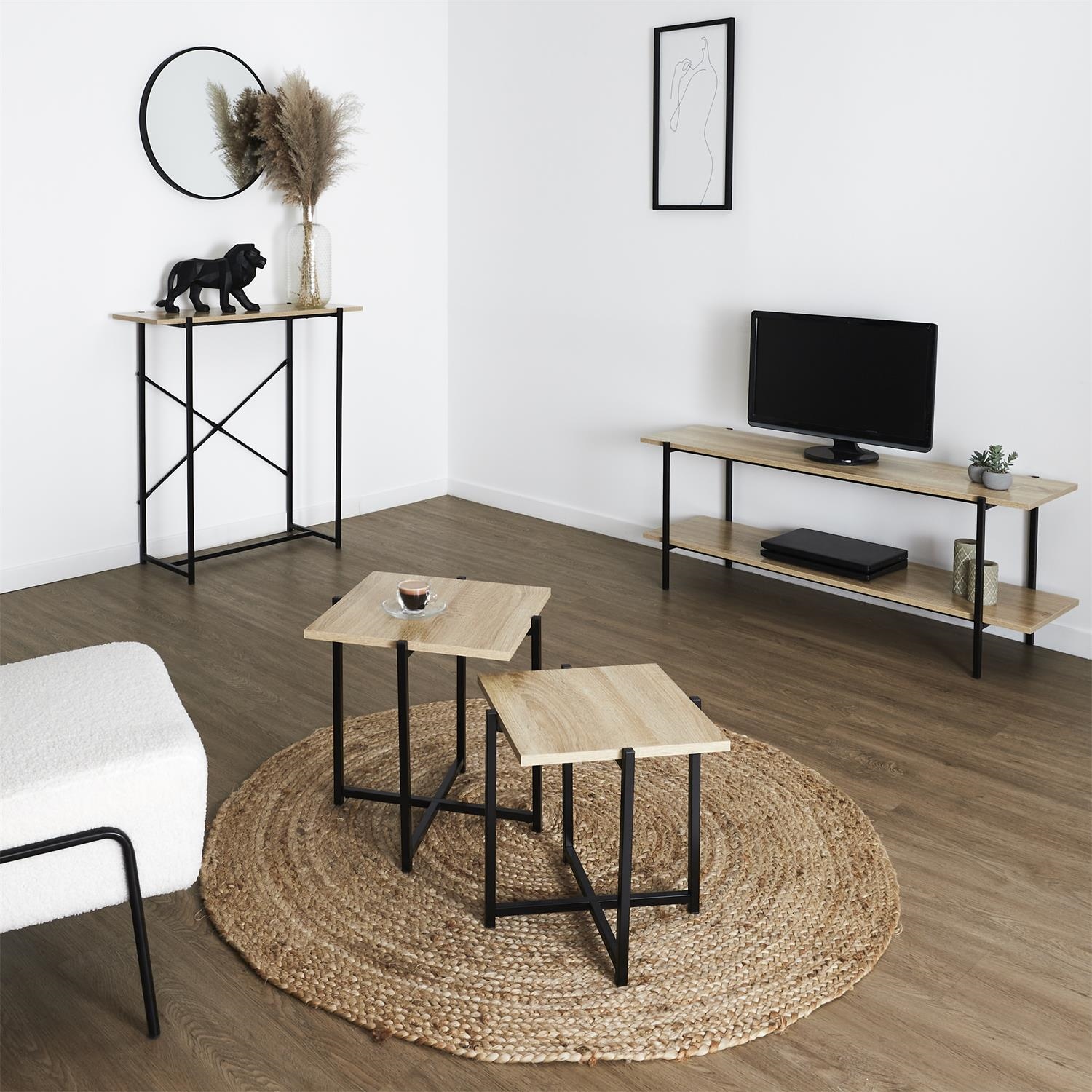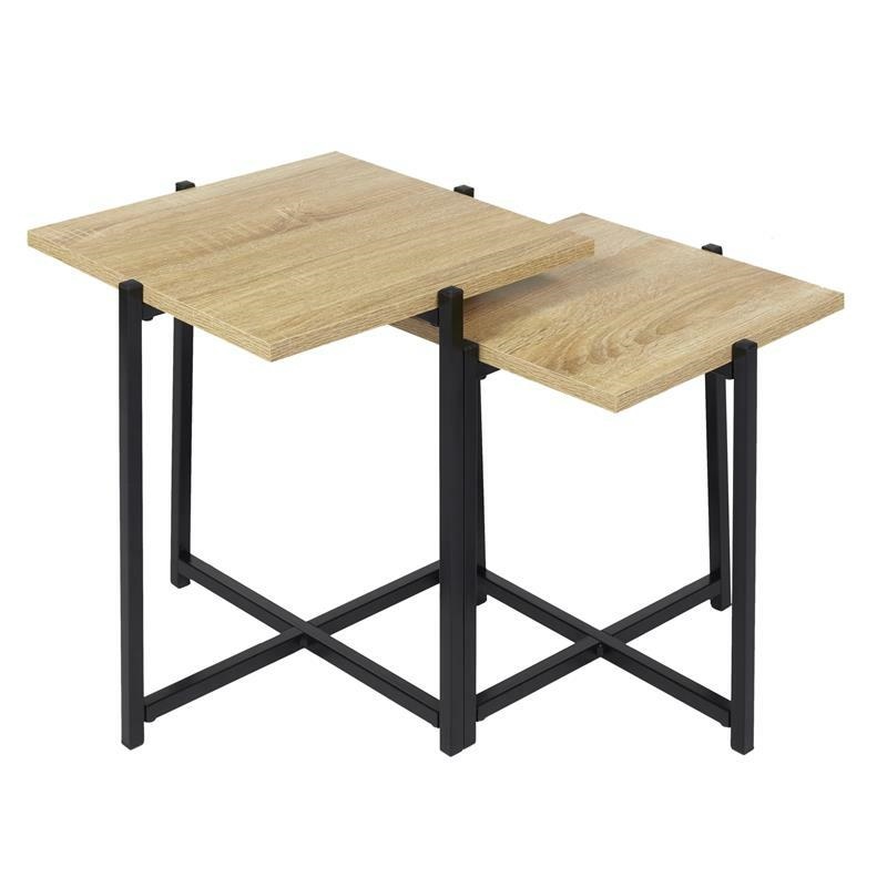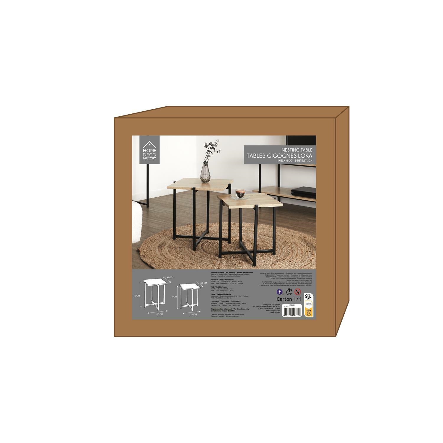 Zestaw 2 stolików Loka sprawdzi się w salonie przed kanapą lub jako dwa oddzielne stoliki w naszym wnętrzu. Zestaw składa się z dwóch stolików o różnych rozmiarach. Stoliki wykonane zostały z płyty MDF oraz metalowych podstaw malowanych proszkowo na czarno. Wymiary stolików: duży 40x 40 x40 cm, mały: 35 x 35 x 35 cm. Materiał blatu MDF. Materiał podstawy metal. Do samodzielnego montażu