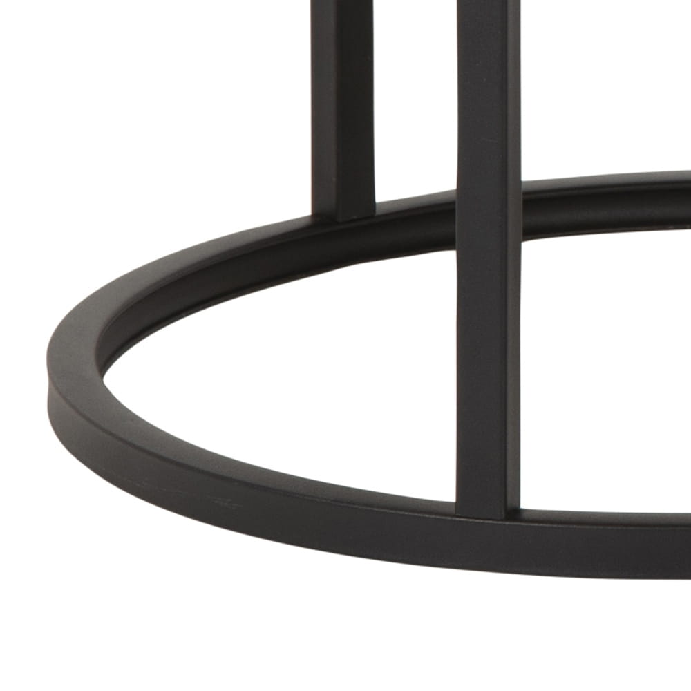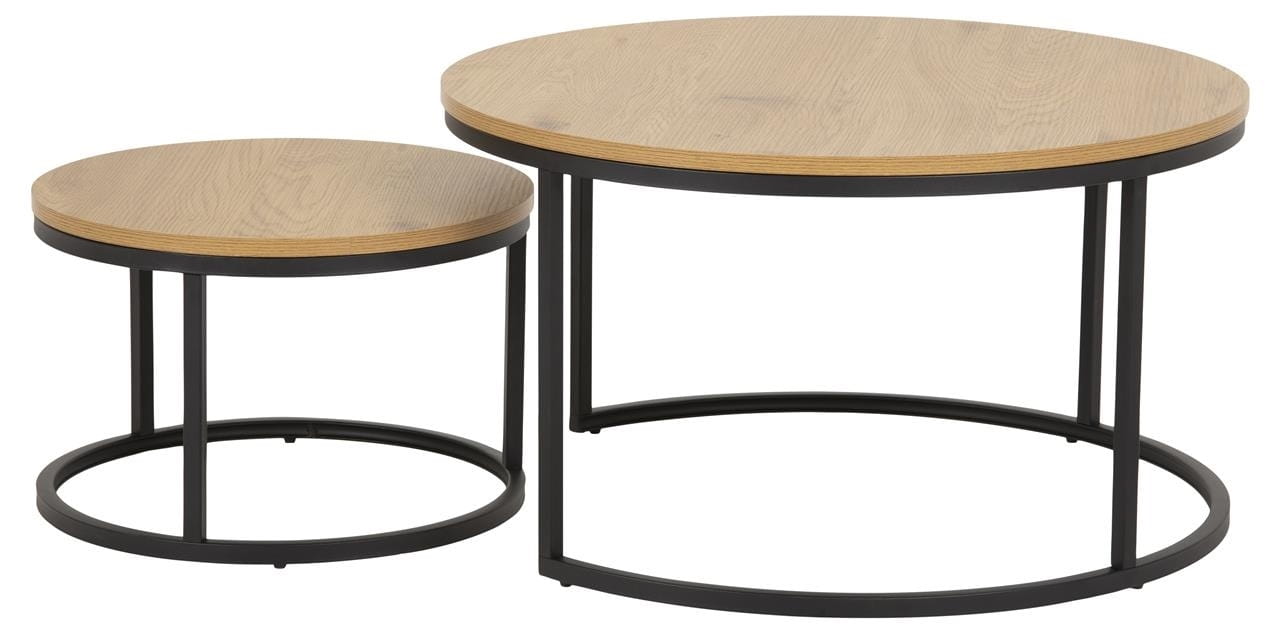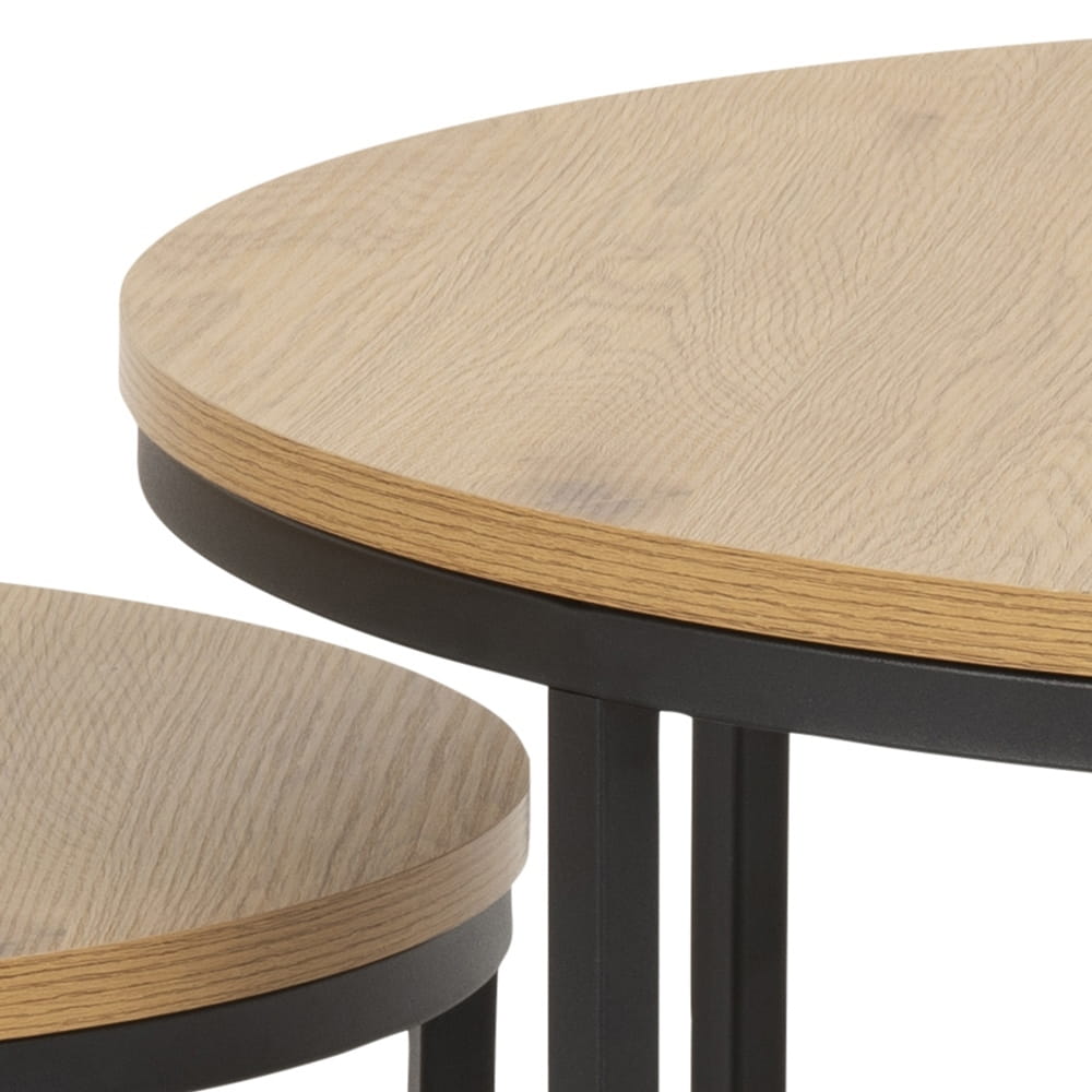 Okrągłe blaty stolików zostały zrobione z laminowanej płyty MDF. Laminat o wzorze oraz kolorze naturalnego dębu ciekawie współgra z czarną metalową podstawą stolików. Okrągłe stoliki posiadają wytrzymałą i stabilną podstawę wykonaną z metalu malowanego proszkowo.