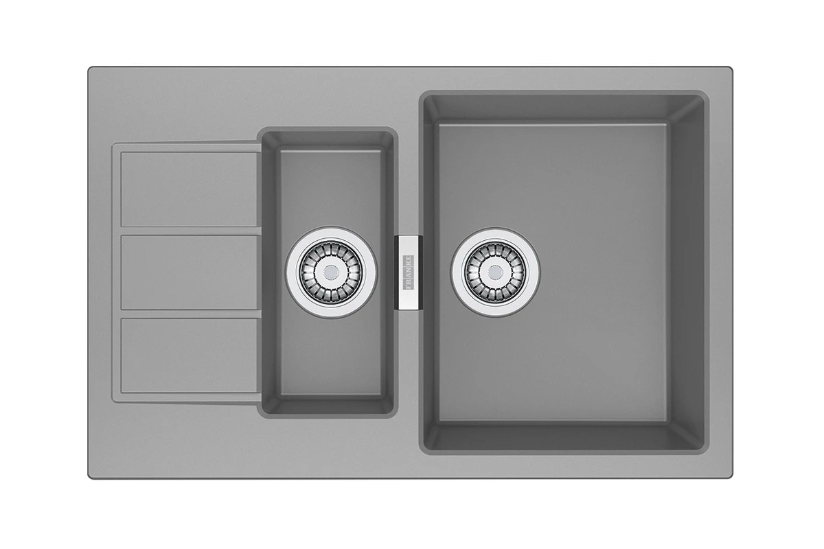 Dwukomorowy zlewozmywak marki Franke, wykonany ze stali typu len. Minimalna szerokość szafki kuchennej zdolnej pomieścić komorę wynosi 60 cm.